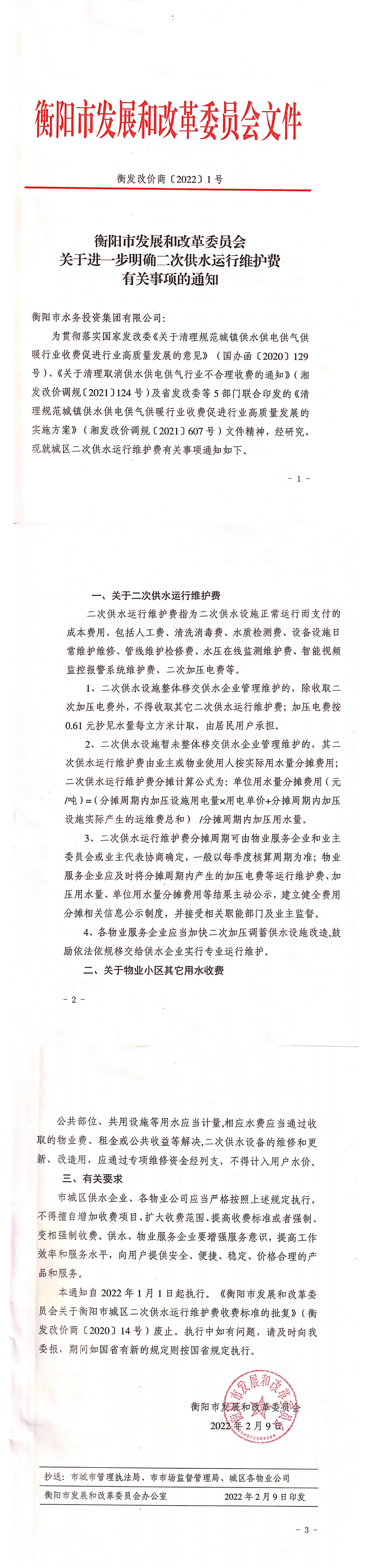 衡阳市发展和改革委员会关于进一步明确二次供水运行维护费有关事项的通知