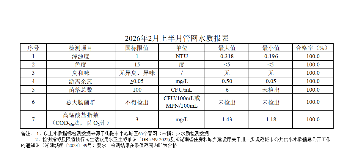 衡阳市水务投2026年2月上半月管网水质报表