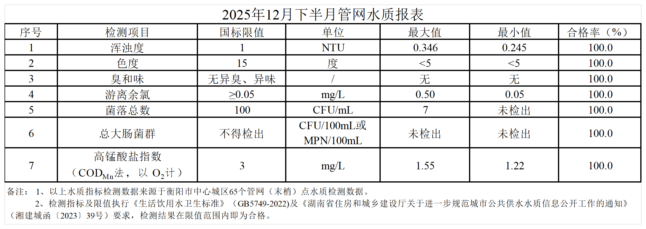 衡阳市水务投2025年12月下半月管网水质报表