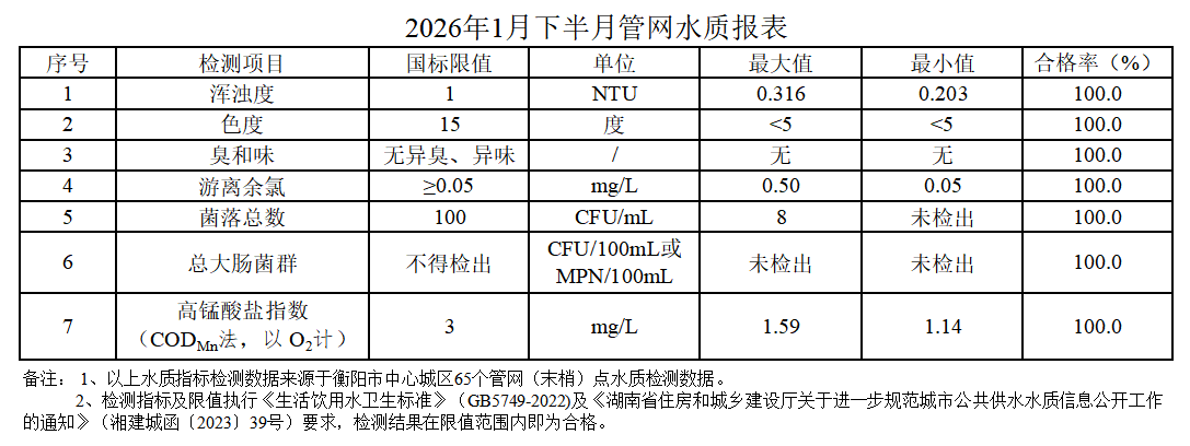衡阳市水务投2026年1月下半月管网水质报表